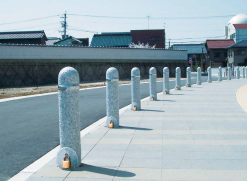 御影石をイメージした擬石調の製品である。本体に鋼管を使用しており、軽量かつ堅牢で天然石に比べると割損や破片の飛散が少ない仕様。耐水性があり、排気ガスなどによる汚れも水洗いで綺麗に掃除できる。