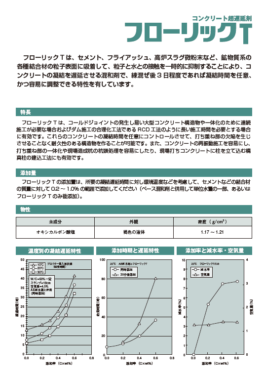 フローリックTは、コールドジョイントの発⽣し易い⼤型コンクリート構造物や⼀体化のために連続施⼯が必要な場合およびダム施⼯の合理化⼯法であるRCD⼯法のように⻑い施⼯時間を必要とする場合に有効。これらのコンクリートの凝結時間を任意にコントロールさせて、打ち重ね部の⽋陥を⽣じさせることなく耐久性のある構造物を作ることが可能となる。また、コンクリートの再振動施⼯を容易にし、打ち重ね部の⼀体化や現場造成杭の杭頭処理を容易にしたり、現場打ちコンクリートに柱を⽴て込む構真柱の建込⼯法にも有効である。