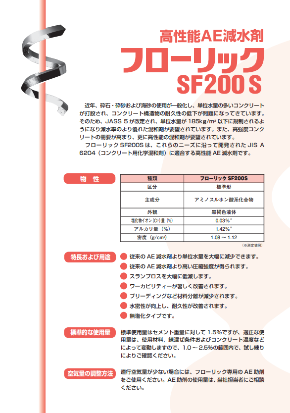 石・砕砂および海砂の使用が一般化し、単位水量の多いコンクリートが打設され、コンクリート構造物の耐久性の低下が問題になっている。 そのため、JASS 5 が改定され、単位水量が 185kg/m3 以下に規制されるようになり減水率のより優れた混和剤が要望されている。 フローリック SF200S は、これらのニーズに沿って開発された JIS A6204(コンクリート用化学混和剤)に適合する高性能 AE 減水剤。