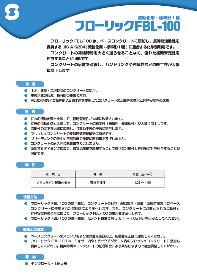 ベースコンクリートに添加し、⻑時間流動性を保持するJIS A 6204(流動化剤・標準形Ⅰ種)に適合する化学混和剤。 コンクリートの凝結時間を⼤きく遅らせることなく、優れた経時安定性を付与することが可能。コンクリートの品質を改善し、ハンドリングや充填性などの施⼯性が⼤幅に向上する。