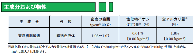 ヴィンソルは、天然樹脂酸塩を主成分としており、良質で微細な空気泡をコンクリート中に連行させることが可能。 天然樹脂酸塩によって連行された空気泡は、コンクリートの状態改善や凍結融解に対する抵抗性の向上などに優れた効果を発揮する。 「ヴィンソル」は JIS A 6204「コンクリート用化学混和剤」の AE 剤(Ⅰ種)に適合。