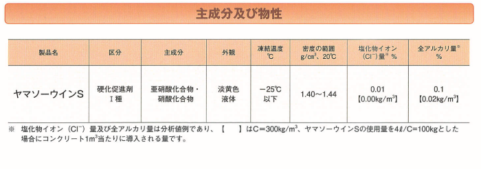 寒冷期の厳しい気象条件において、コンクリートが凝結・硬化の過程で凍結すると、硬化不良や必要な強度が得られない等の初期凍害が起こる。このため、コンクリートの品質を確保するためには、事前の綿密な製造・施工計画と養生の管理が重要とされている。 ヤマソーウインSは、コンクリートの凍結温度を下げ、凝結・硬化を促進させることにより、初期凍害の防止に必要な強度が早期に得られる。更に、その後の強度発現性も確保することができる寒中コンクリートの製造・施工に適したコンクリート用化学混和剤である。