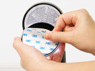 本体側面の▲シール(標準電波受信用アンテナ位置の目印)を確認し、▲を天に向けた状態で押し付けるように貼る。