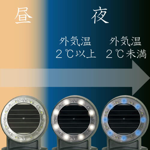 内蔵した温度センサーが筐体周辺の雰囲気温度を測定し、2℃未満になると白色から青色にLEDの発光色を切り替える。視線誘導と同時に、ドライバーに路面凍結注意を促すことができる。